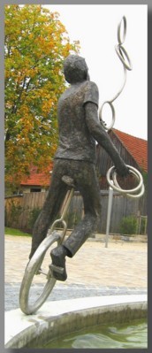Bewegungsfluß zu halten. Der Einradfahrer steht vor der Hauptschule